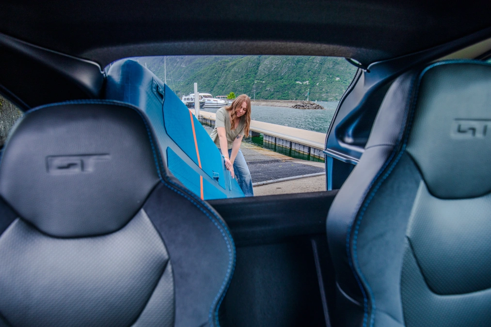 Pakiet wnętrza „GT” obejmujący: Niebieskie pasy bezpieczeństwa. Chromowane wykończenie 4 otworów wentylacyjnych. Wyjątkowa, trójmateriałowa tapicerka "GT". Niebieski sitodruk prędkościomierza (4) Niebieskie, haftowane i obszywane dywaniki. Karbonowe wykończenie kierownicy. Gałka dźwigni zmiany biegów carbon look. |