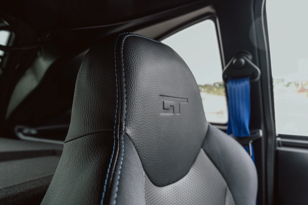 | Skórzana, czarna tapicerka z przeszyciami |